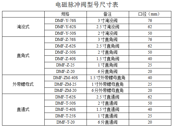 電磁脈沖閥規(guī)格型號(hào)參數(shù)表